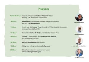 Ondernemers zijn op DV. 21 maart vanaf 16:00 van harte welkom op ons businessevent in Hardinxveld- Giessendam ter gelegenheid van het 50 jarig bestaan van Bonisa. We hebben een boeiend en gevarieerd programma dat begint bij Holland Shipyards Group en verder gaat bij Het Groene Virus. Naast een rondleiding, een toespraak en tijd voor netwerken in een unieke omgeving, wordt er ook een veiling gehouden onder leiding van veilingmeester Arie Balkenende.